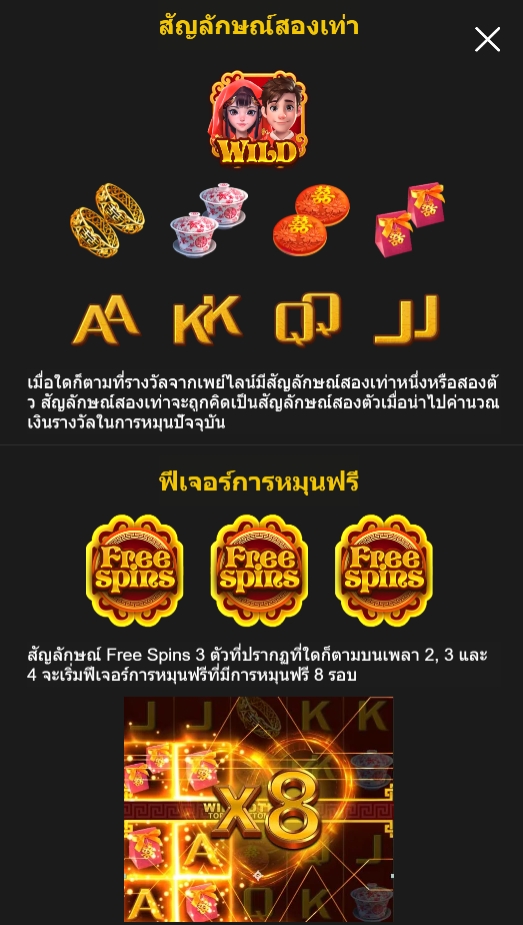 Double Delight เกมสล็อตธีมงานแต่งงาน งานมงคลที่เจ้าบ่าวเจ้าสาวมาในธีมจีนโบราณ ภาพสวย ถ่ายทอดความมีเสน่ห์และบรรยากาศที่น่ายินดีเต็มไปด้วยเสียงเพลงและเอฟเฟกต์ที่ทำให้รู้สึกสนุกมีชีวิตชีวา เจ้าบ่าวเจ้าสาวเตรียมเงินรางวัลมากมายมอบให้กับแขกที่มาร่วมงานของพวกเขา ผ่านวงล้อ 5×3 ที่เต็มไปด้วยสีแดงมงคล สัญลักษณ์สวยๆสไตล์จีนโบราณ ภาพ 3 มิติที่จะทำเงินให้ผู้เล่นชนะได้สูงสุด x100,000 เท่าของเงินเดิมพันเลย