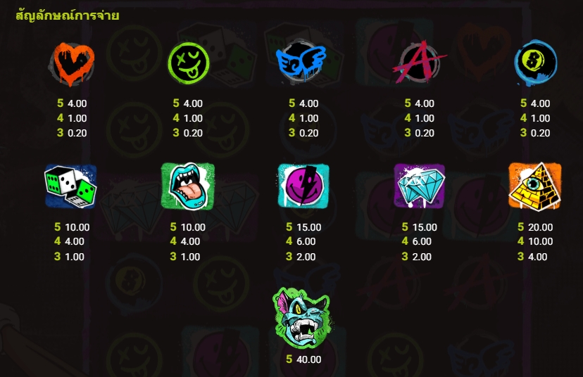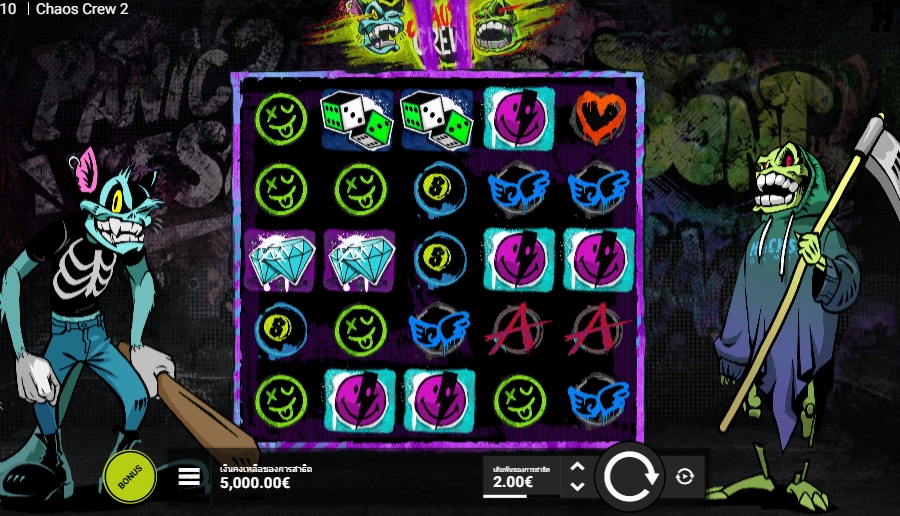 CHAOS CREW 2 รีวิวเกมสล็อตวีดีโอ ตัวเกมเป็นรูปแบบ 5 รีล 5 แถว เป็นเกมมาแรง RTP 96.27% พร้อมมอบเงินรางวัลโบนัสสูงสุดให้ผู้เล่นกว่า 20,000 เท่า ของเงินเดิมพัน ถือว่าสูงกว่าหลายๆเกมจากค่ายเดียวกันเลย มีฟีเจอร์ความสนุกสุดมันส์ให้คุณป่วนเมืองไปพร้อมสเปรย์สีกับเจ้าแมวจอมหงุดหงิด ครองถนนแห่งความมั่งคั่งเป็นผู้ยิ่งใหญ่ไปกับแมวและยมทูต วงล้อที่จะพานักเดิมพันไปร่ำรวยแบบไม่อั้น เพิ่มฟีเจอร์สุดเจ๋งลงในภาค 2 นี้แบบจัดเต็ม