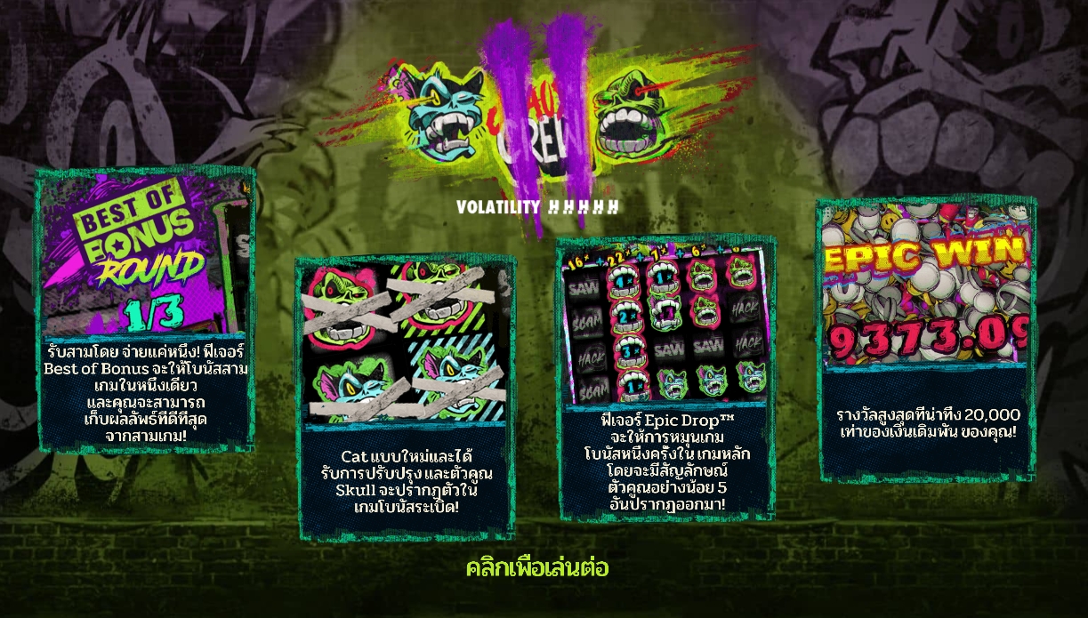 เกมสล็อตเว็บตรง CHAOS CREW 2 อัพเดทใหม่แตกหนักกว่าเดิม เกมสล็อตจากค่ายเกม Hacksaw Gaming ฟีเจอร์พิเศษภายในเกมใส่มาให้แน่นวงล้อจกโบนัสฉ่ำๆให้ผู้เล่นชนะง่ายแบบฉ่ำๆ ไม่เกรงใจใคร Cranky และ Sketchy มาก่อกวนบนถนนเป็นสัญญาณของความป่วนและความรวยเมื่อผู้เล่นได้รับฟีเจอร์ Epic Drop สัญลักษณ์ตัวคูณอย่างน้อย 5 สัญลักษณ์ปรากฎบนวงล้อ ฟีเจอร์ แมวขี้หงุดหงิดที่สุด เป็นสัญลักษณ์ Wild ทดแทนสัญลักษณ์บนตารางจ่ายเงินได้และพร้อมทั้งมีค่าตัวคูณในตัวตั้งแต่ 2x ถึง 20x เท่าของเงินเดิมพันเลย และที่ขาดไม่ได้คือเกมโบนัสที่ทำให้เกมนี้เป็นที่ชื่นชอบถูกใจของนักปั่นสล็อตเพราะกำไรสุดปัง ฟีเจอร์ที่ทำให้ Chaos Crew รับโบนัสสามแบบ มีโบนัสให้ผลลัพธ์ที่ดีที่สุดแก่คุณสามเกม Regular, Sticky, Epic และ Epic Sticky ลุ้นรับตัวคูณได้สูงสุด 100 เท่าในรอบนี้เลย หากสุ่มได้ สแคทเตอร์สี่ตัว รับ Best of Bonus 7 สปินฟรี พร้อมคุณสมบัติพิเศษระเบิดเงินให้ผู้เล่นแบบจักเต็มกว่าภาคแรกแน่นอน