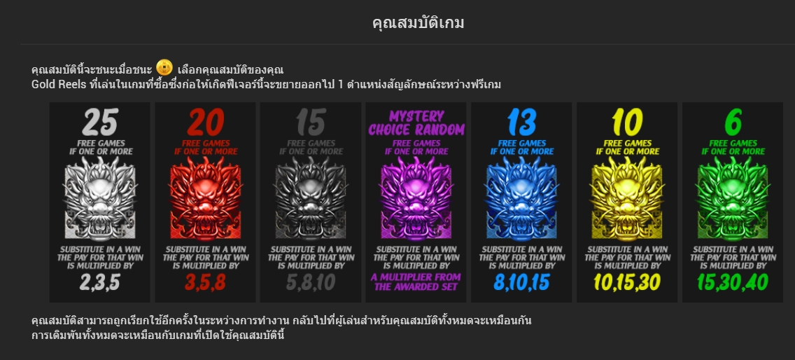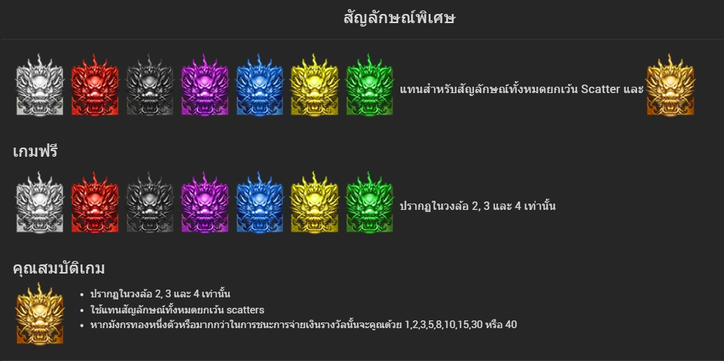 พาทำความรู้จักเกมสล็อตชื่อดังยอดนิยม 7 Dragons มาพร้อมฟีเจอร์สุดพิเศษแจกให้แบบไม่มีกั๊ก จากค่ายเกม NEXTSPIN ผู้เล่นจะได้ไปสัมผัสความมั่งคั่งไม่มีสิ้นสุด ด้วยฟีเจอร์เด็ดๆมากมายถูกออกแบบมาให้มีโอกาสชนะเพิ่มมากขึ้น คุณสมบัติพิเศษฟีเจอร์ไวด์มังกรทองทดแทนได้ทุกสัญลักษณ์ยกเว้น Scatter ข้อดีของเกมนี้คือสปินฟรีเข้าบ่อยมาก แจกสปินฟรีบ่อยสุดๆ แถมสปินฟรีมีให้เลือกหลากหลาย ทั้งแบบมังกรสีเงิน รับ 25 สปินฟรีแถมตัวคูณ x2 , 3 , x5 เท่าของเงินเดิมพันเลย มังกรสีแดงให้ 20 ฟรีสปินพร้อมตัวคูณ x3 , x5 , x8 เท่า , มังกรสีดำให้ 15 ฟรีสปินพร้อมตัวคูณ x5 , x8 , x10 เท่า , มังกรสีฟ้าให้ 13 ฟรีสปินพร้อมตัวคูณ x8 , x10 , x15 เท่า , มังกรสีเหลืองให้ 10 ฟรีสปินพร้อมตัวคูณ x10, x15 , x30 เท่า , มังกรสีเขียวให้ 6 ฟรีสปินพร้อมตัวคูณ x15 , x30 , x40 เท่า คุณรับแจ็คพอตก้อนโตได้แน่นอน สัญลักษณ์ที่เข้าเกมฟรีคือรูปเหรียญทอง