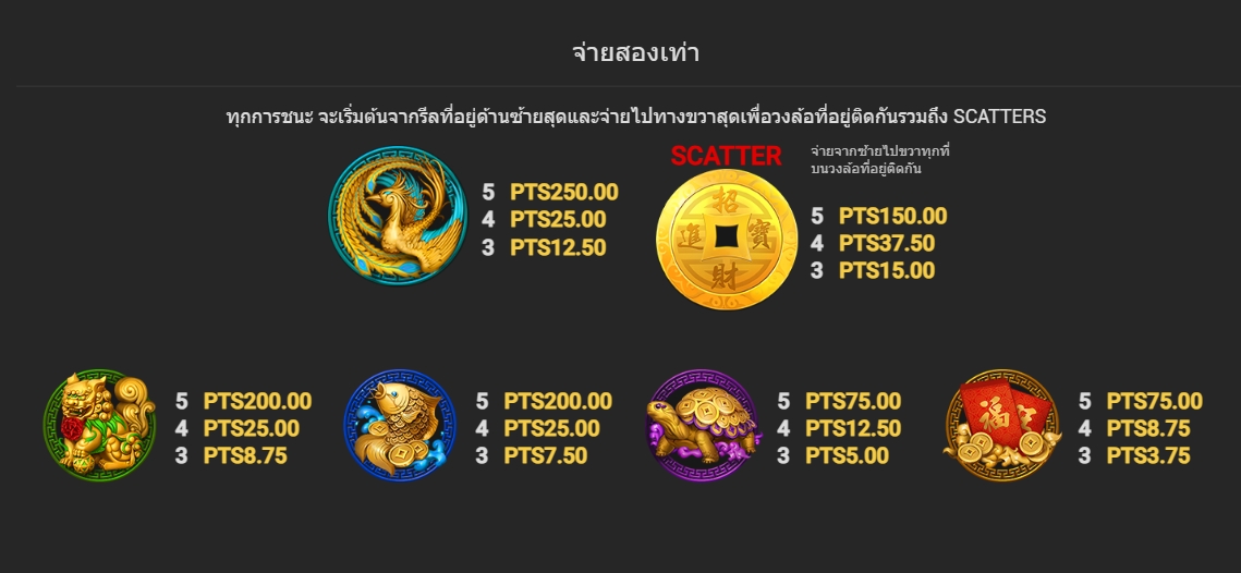 เว็บสล็อตแท้ 100% แตกง่าย ไม่มีขั้นต่ำ รับทรูวอเลท สมัครเข้ามารวยได้เลยที่ทางเข้าสล็อตpg pg slot 42 มังกรพาแตกรับรางวัลใหญ่จนคุณต้องตกตะลึงแน่นอน ชนะได้ไม่อั้น รับสปินฟรีได้บ่อย แถมโอกาสชนะมีทั้ง 243 วิธี และ 576 วิธีเลย วิธีการชนะแบบง่ายๆเริ่มต้นจากรีลซ้ายสุดของวงล้อไปทางขวาเสมอ สัญลักษณ์ทำเงินสูงมีทั้งฟีนิกซ์ สิงโต ปลา เต่า ถุงทอง รองลงมาคือตัวอักษรและตัวเลขต่างๆ แจกตัวคูณทั้งในเกมหลักและเกมโบนัสเมื่อได้มังกรทองนอกจากช่วยทดแทนสัญลักษณ์แล้วยังสามารถสุ่มแจกตัวคูณตั้งแต่ x1 เท่าจนถึง x40 เท่าของเงินเดิมพันเลย สล็อต แตกง่าย แห่งปี เกมสล็อตที่คุณห้ามพลาด ตำนานมังกรจีนสนุกและท้าทาน เล่นเลย! รับโชคต่อเนื่องไม่จำกัด!