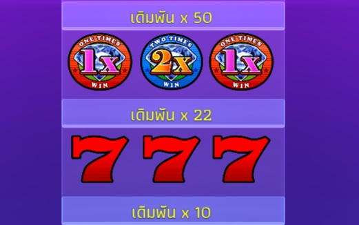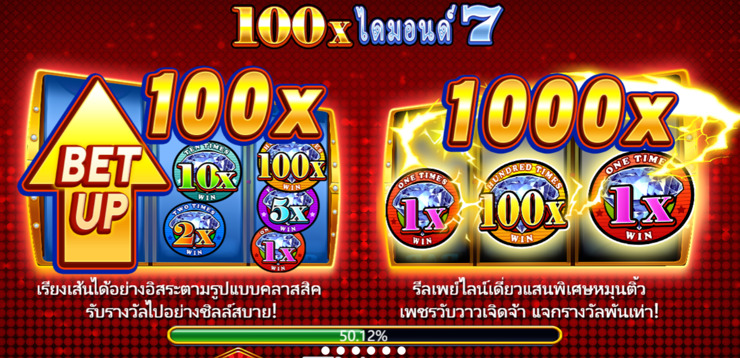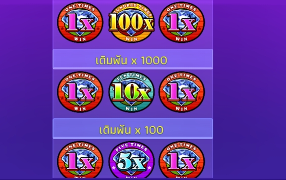 เกมสล็อตออนไลน์ยอดฮิต 100x Diamond 7 อัตราการจ่ายเงินรางวัลสูงสุดถึง x1000 เท่าของเงินเดิมพันเลย YGR Games มาพร้อมกราฟิกสุดหรูหราตระการตา พร้อมสูบฉีดหัวใจผู้เล่นให้สั่นไหวด้วยความตื่นเต้น ดนตรีสนุกๆคอยเพิ่มอารมณ์ชัยชนะอันหอมหวานจะทำให้ผู้เล่นยิ้มอย่างมีความสุขได้บ่อยแน่นอนเกมนี้ การจ่ายเงินที่สูงมากๆคือสัญลักษณ์ไวด์ตัวคูณ x1, x100 x1 เมื่อได้รัยพร้อมกันก็คว้าแจ็คพอตใหญ่ไปได้เลย นอกจากนี้ยังมีรางวัลรองลงมาคือ คูณ 1 คูณ 10 คูณ 1 รับกำไร x100 เท่าของเงินเดิมพัน หากได้คูณ 1 คูณ 5 คูณ1 ก็รับกำไร 50 เท่าของเงินเดิมพันเลย และ เมื่อได้รับคูณ 1 คูณ 2 คูณ 1 รับกำไร 22 เท่า นอกจากนี้ยังมีสัญลักษณ์ทำเงินหลากหลายที่พร้อมพาผู้เล่นไปรวยแค่เพียงกดสปิน