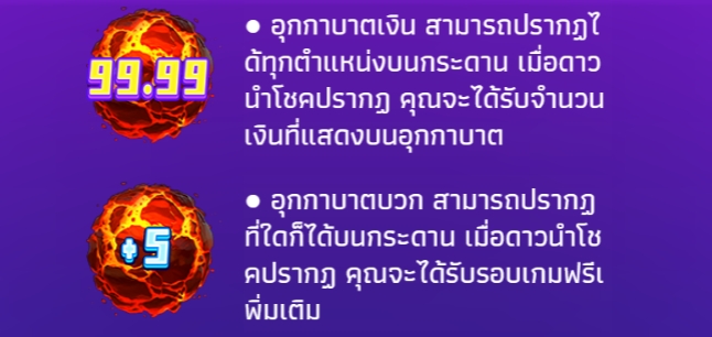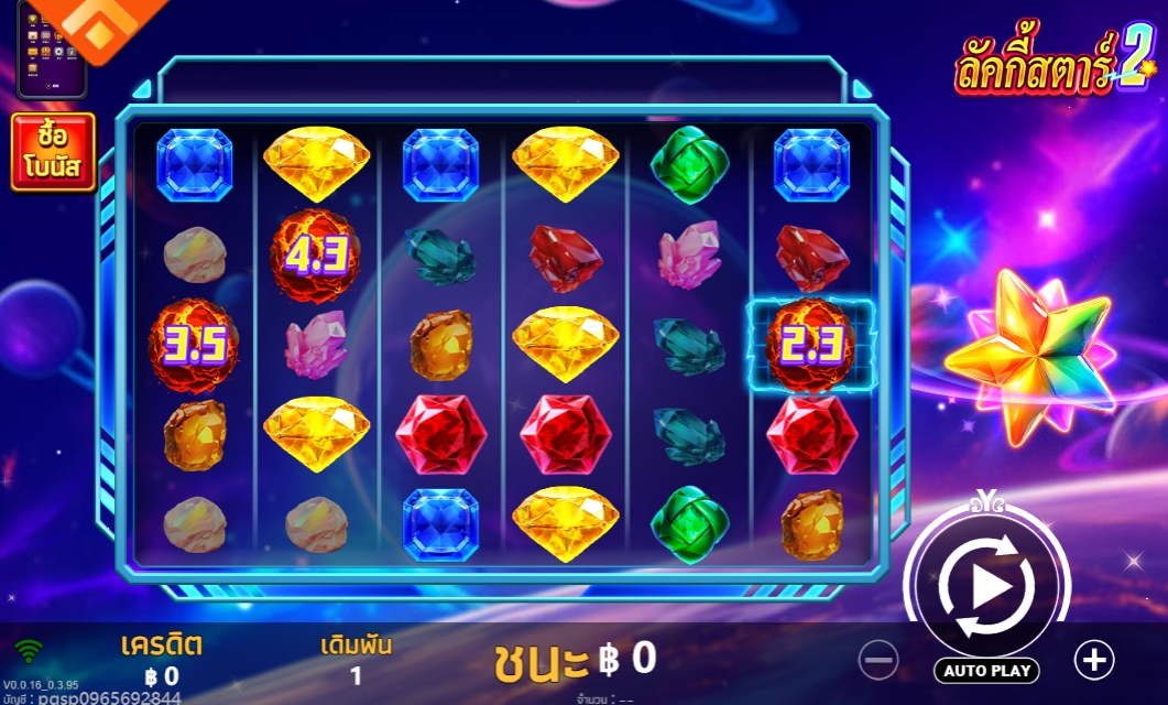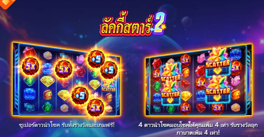 Lucky Star2 ก้าวเข้าสู่ความรวยบนวงล้อที่พาคุณไปยังท้องฟ้าที่เต็มไปด้วยดวงดาวพร่างพราย พบกับอุกกาบาตลึกลับและเหล่าดาวตกที่พร้อมจะเทลงมาเป็นฝนดาวตกเข้าสู่กระเป๋าเงินคุณ ดวงดาวเหล่านี้มีค่าเป็นเงินมหาศาล โบนัสจะพุ่งกระจายทั่ววงล้อ ในจักรวาลที่ไร้ขอบเขตให้เงินรางวัลพร้อมตัวคูณกว้างใหญ่ไพศาล เหล่าดวงดาวจะชี้นำคุณให้ทะยานขึ้นไปรับโชคก้อนโตเป็นเงินรางวัลมากกว่า 1,000 เท่าของเงินเดิมพันเลย