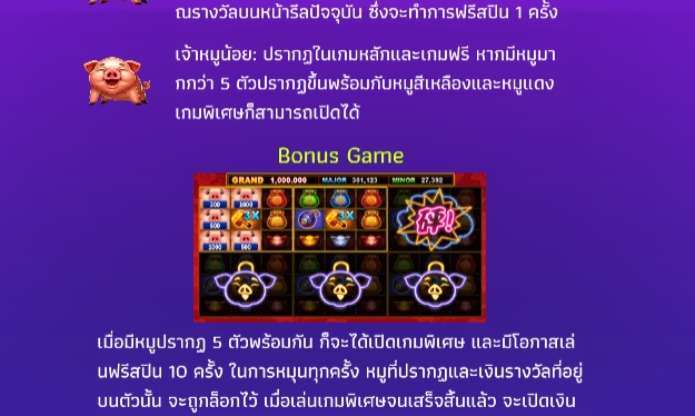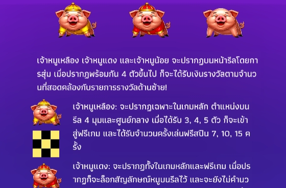 เพลิดเพลินกับเกมสล็อตออนไลน์ที่น่ารักที่สุดในขณะนี้ จากค่ายเกม YGR Games เข้ามาเล่นได้เลย เจ้าหมูพร้อมแจกรางวัลใหญ่ก้อนโตๆให้ทุกท่านแล้ว ดับเบิ้ลโชคลาภให้ผู้เล่นได้ทุกชั่วโมง เกมนี้จะมีเจ้าหมูเหลือง เจ้าหมูแดง และหมูน้อย เมื่อปรากฎ 4 ตัวขึ้นไปจะได้รับเงินตามจำนวนที่ปรากฎด้านซ้ายเลย ยิ่งเดิมพันสูงเงินรางวัลยิ่งสูงตามไปด้วยนะทุกคน และยังมีฟีเจอร์สุดพิเศษ เมื่อสุ่มได้ เจ้าหมูเหลืองสี่มุมจะได้รับสปินฟรีเริ่มต้น 7 ครั้งสูงสุด 15 ครั้งเลย เจ้าหมูแดงจะช่วยล็อกสัญลักษณ์เพิ่มโอกาสชนะให้ผู้เล่นมากยิ่งขึ้นและเจ้าหมูน้อยสามารถเปิดเกมพิเศษให้ผู้เล่น 10 เกมส์ฟรี หากปรากฎรูปค้อนรับตัวคูณไปเลยให้ผู้เล่นได้รวยไม่รู้ตัว