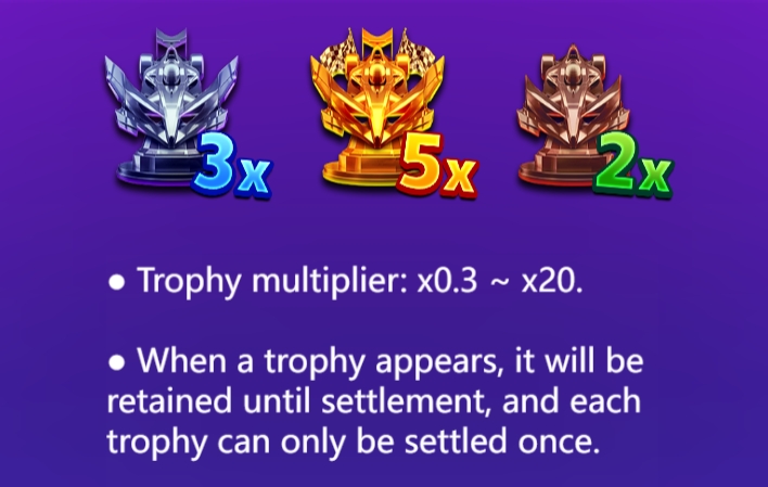เพลิดเพลินกับเกมสล็อตออนไลน์สุดปัง จากค่ายเกม YGR Games ตัวเกมมาในรูปแบบวงล้อสุดเจ๋ง ขนาดรีล 3×3 มีสัญลักษณ์ที่ออกแบบมาเข้ากับธีมเกมได้อย่างลงตัว แถมยังมีฟีเจอร์พิเศษคือถ้วยรางวัล 3 สี ถ้วยรางวัลสีทอง ถ้วยรางวัลสีเงิน และถ้วยรางวัลสีทองแดง จะมอบโฐนัสพิเศษให้ผู้เล่น เมื่อได้รับสัญลักษณ์เหล่านี้บนวงล้อมันจะสะสมเป็นจำนวนสปินฟรีและตัวคูณที่เพิ่มขึ้นให้ผู้เล่น และเมื่อสุ่มได้ รวบรวมสัญลักษณ์ SCATTER 3 อันเพื่อเปิดเกมโบนัสแบบสุ่ม Scatter ของเกมนี้จะมี 4 ประเภท คือถ้วยรางวัลทั้งสามสี และธงแข่งรถ